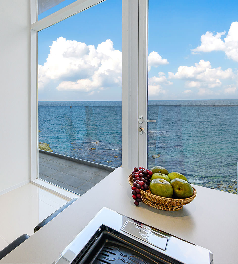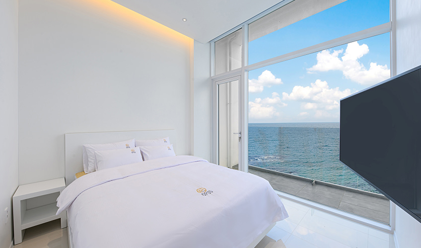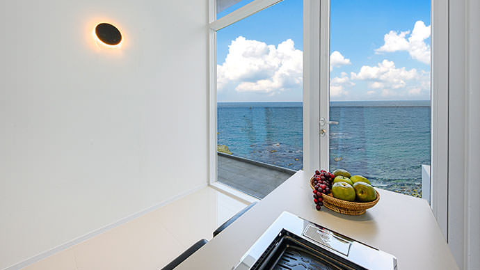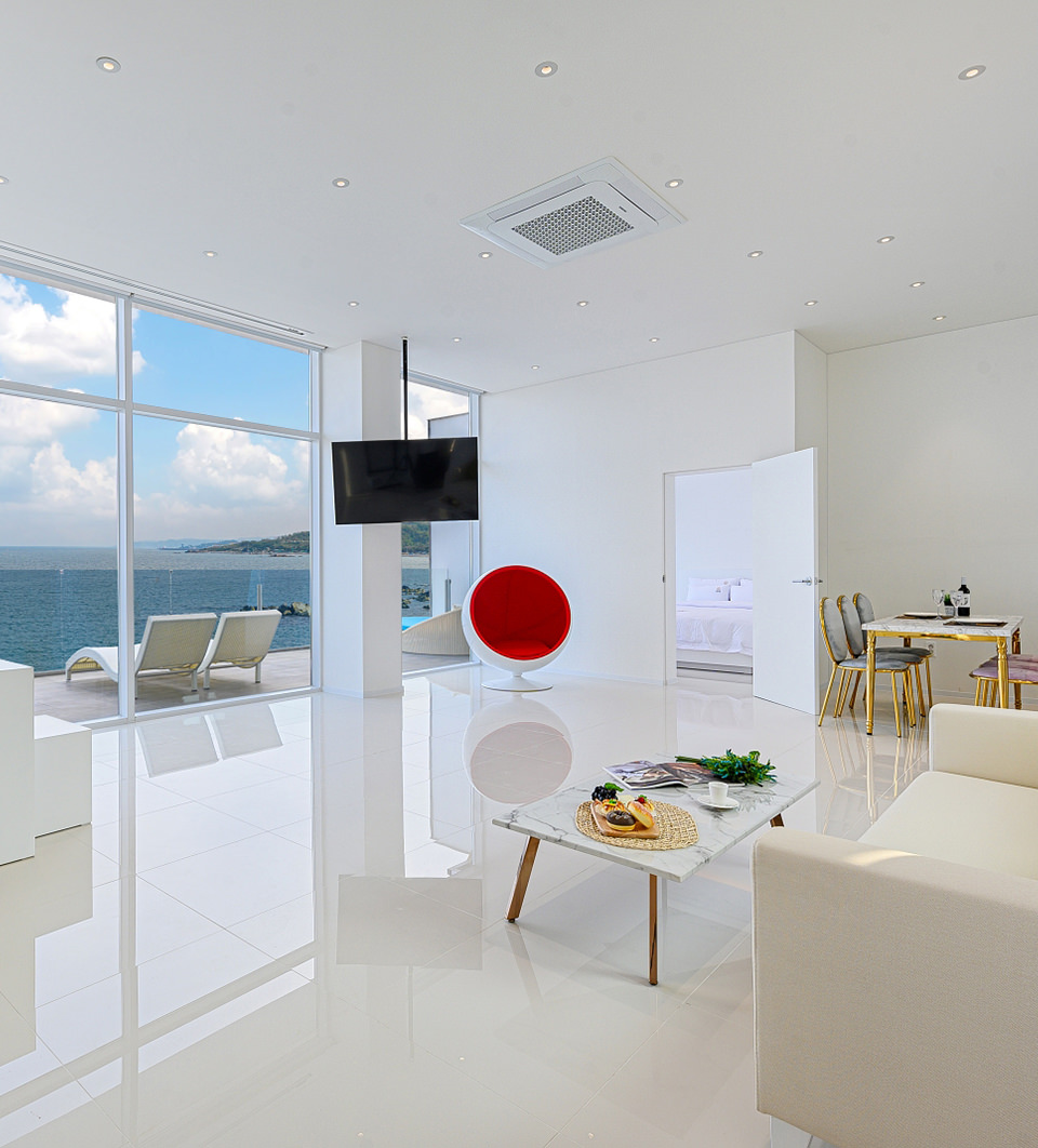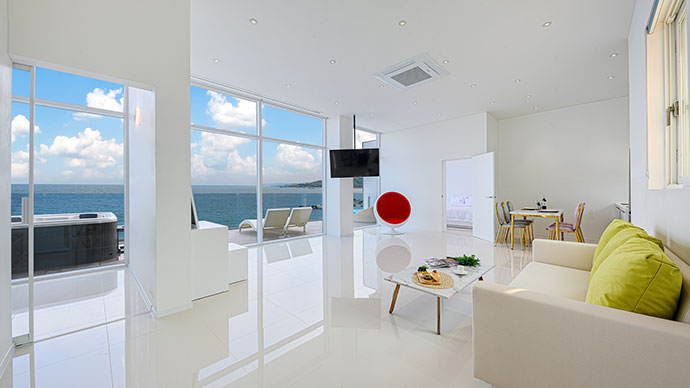 넓은 통유리로 보이는 오션뷰와 깔끔한 신축 모던인테리어